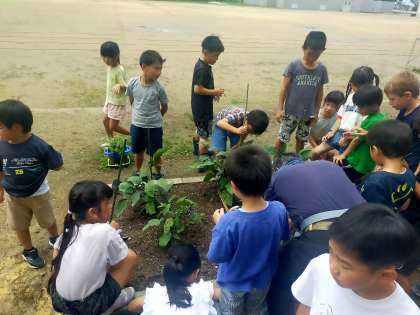 ナスが大きくなってきて、「小さな支柱では苦しそう!」という意見が出たため、みんなで協力して支柱を立てました。