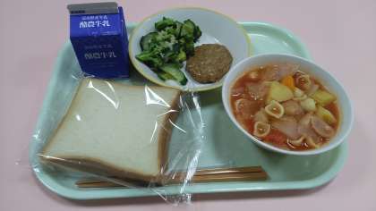 6月25日(火)の給食 公開日 2024/06/25 更新日 2024/06/25 学校から 今日の給食です。 【献立】 食パン 牛乳 チキンハンバーグ グリーンサラダ 野菜とソーセージのトマト煮 です。