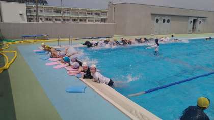 3・4年生は、5時間目にプールに入っていました。3つのグループに分かれて、能力別に練習に取り組んでいました。水が冷たくて気持ちよさそうでした。