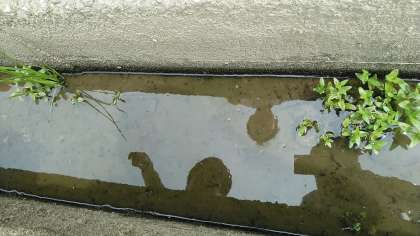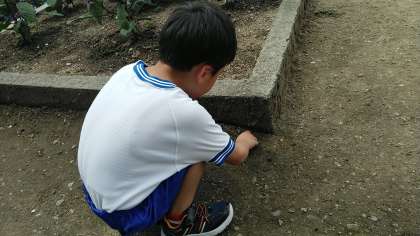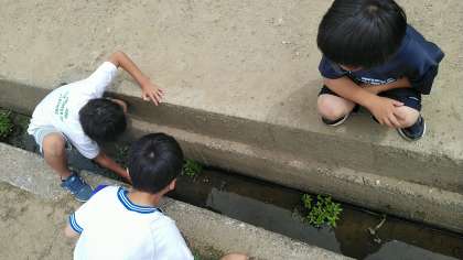 ぐんぐんタイムの時間に、校舎側とグラウンドの境にある用水をじっと見詰めている子供がいました。「ちっちゃい、ちっちゃい貝みたいのが動いている。」言われた所をじっと見てみると、何やら小さな貝みたいなものが動いていました。タニシ?カワニナ?何か生まれたばかりの小さな生き物がいるみたいです。何かの赤ちゃんを見付けて嬉しそうでした。このあと、花壇の角でだんご虫も見付けたそうです。