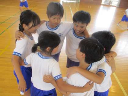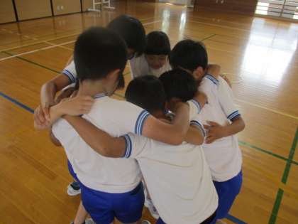 体育科の学習では、2チームに分かれて、キックベースボールの練習をしています。攻撃の順番や守備の位置等、毎時間作戦を考え直してから試合をしています。今日は4試合目。試合前には両チームとも円陣を組んで、やる気を高めていました。