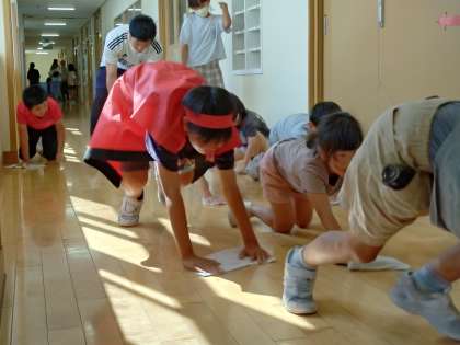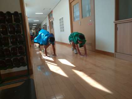 7月2日(火) 倉垣レンジャーと掃除をしょう! 公開日 2024/07/02 更新日 2024/07/02 学校から 今朝は、倉垣レンジャーの呼びかけで、きらきらタイムの時間にみんなで廊下の雑巾がけをしました。