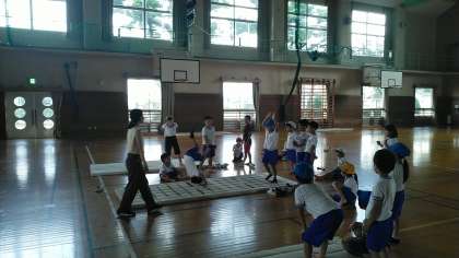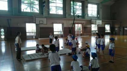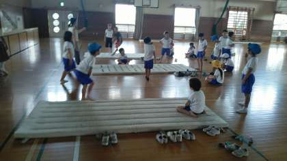 2年生の1時間目は、体育科の学習でした。体育館でマット運動をしていました。倒立前転は、やはり難しいみたいです。