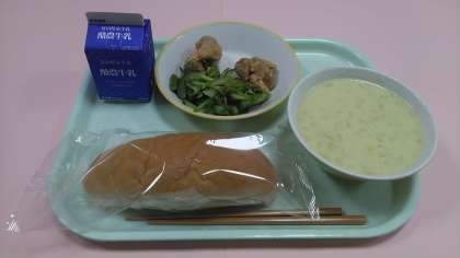 今日の給食です。 【献立】 コッペパン 牛乳 フライドチキン アスパラサラダ コーンポタージュ です。