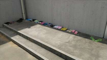 1・2年生がプールに入っているときは、入口のサンダル等がとてもきれいに並んでいます。ぬいだときに先生から指導されているんだなと思います。きれいに並んでいるのを見ると、とてもいい気持ちになるし、嬉しくもなります。ぜひ、他の学年にも広がってほしいです。夏休みにプールに来たときまで、このきれいに並んでいるサンダル等が続いていたらすてきです。