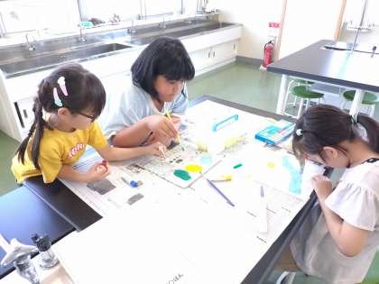 2時間目にファミリー班で、地域のだらまつりに出す行灯をつくっています。