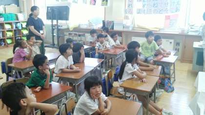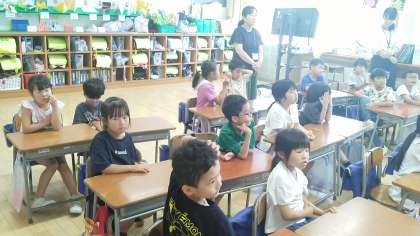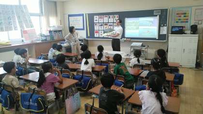 1年生の1時間目は、外国語活動の時間でした。ALTから外国の博物館の様子を教えてもらっていました。