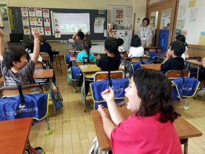 2年生は、5時間目に、初めての外国語に取り組みました。ALTの先生と一緒に楽しく活動しました。新しく習うことを一生懸命メモしている姿も見られます。