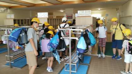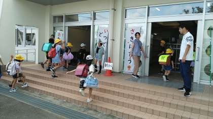 今朝の児童玄関の様子です。天気もよく、今日は暑くなりそうです。