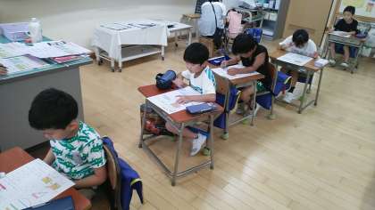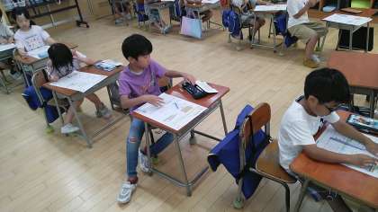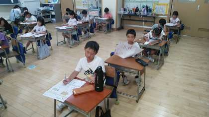 1年生の3時間目は、算数科の学習でした。どちらが長いのテストをしていました。