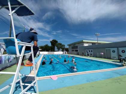子供たちの安全のため倉垣小学校では、PTAのプール当番3名と教員2名で監視をしています。