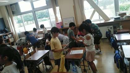 始業式のあと、2年生教室では、「夏休みビンゴ」を楽しみながら夏休みにあったこと等について友達と紹介し合っていました。