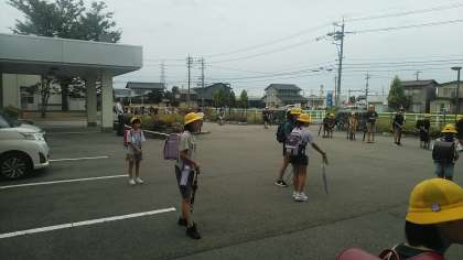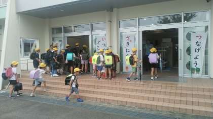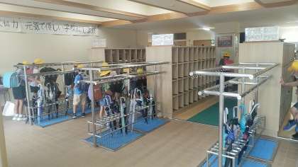 今朝の児童玄関の様子です。曇り空でしたが、軒下で感じることのできるミストに喜んでいる児童がたくさんいました。
