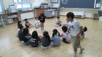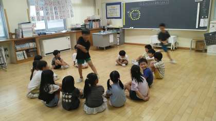1年生の3時間目は、生活科の学習でした。ルールを工夫して実際にあそんでみようという学習でした。「ハンカチ落とし」のルールを工夫して実際に遊んでいました。