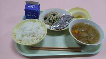 今日の給食です。 【献立】 ごはん 牛乳 さばの銀紙焼き はりはり和え 冬瓜スープ 梨 です。