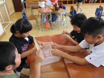 理科の学習で、春から育てているオクラとヒマワリの実から種を採りました。一つの実の中からたくさんの種がとれたことに、驚いていました。