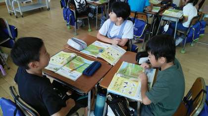 3年生の5時間目は、理科の学習でした。クワガタやバッタ等がなぜそこにいるのかを話し合っていました。この後、実際に探しにいくみたいです。