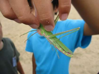 教室で話し合った後、実際にグラウンドの草むらに行って虫を探すと、バッタを何匹も見付けました!