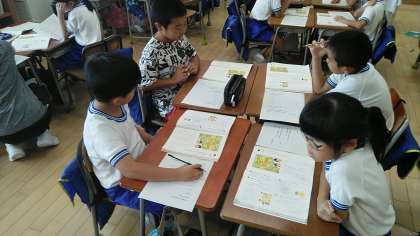 2年生の2時間目は、国語科の学習でした。話し合う練習として、グループで道案内をしていました。