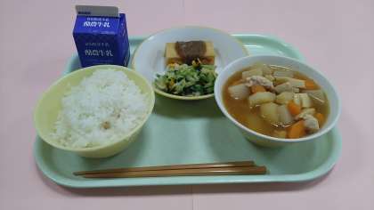 今日の給食です。 【献立】 ごはん 牛乳 揚げ出し豆腐のごまだれかけ コーン和え 大和煮 です。