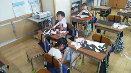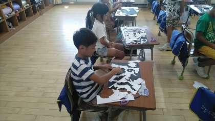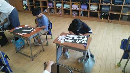 2年生の3時間目は、図画工作科の学習でした。白い紙をハサミで切って、黒い画用紙の上に再構成して表す「ハサミのアート」の作品をつくっていました。
