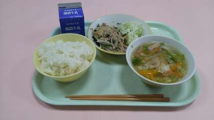 今日の給食です。 【献立】 ごはん 牛乳 豚キムチ丼 ゆでキャベツ はくさいスープ です。