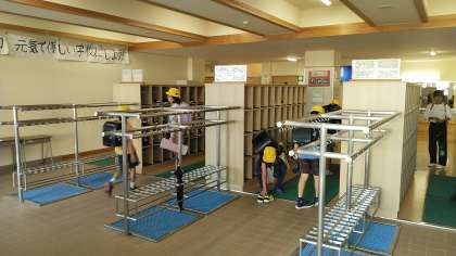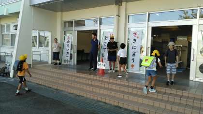 今朝の児童玄関の様子です。今日は、天気もよかったので、ミストが気持ちよさそうでした。