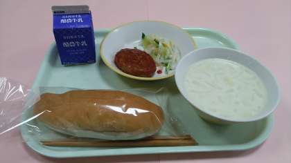 9月10日(火)の給食 公開日 2024/09/10 更新日 2024/09/10 学校から 今日の給食です。 【献立】 コッペパン 牛乳 ハンバーグのケチャップかけ 大根サラダ クリームスープ です。