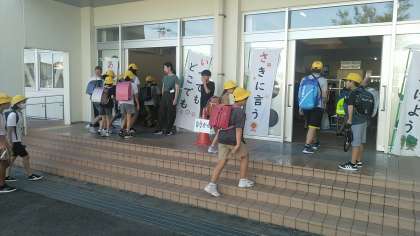 今朝の児童玄関の様子です。天気がよく、児童の元気な挨拶も多かったです。