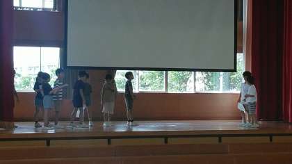 2年生は、2時間目に体育館で表現発表会の練習をしていました。かけ算九九に関係する劇みたいです。