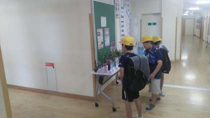 「道」クラブの子供たちが花を飾った花瓶をたくさんの子供たちが足を止めて見ていました。
