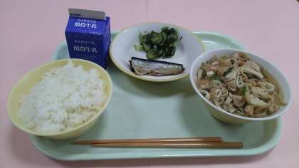 今日の給食です。 【献立】 ごはん 牛乳 いわしの土佐煮 とろろ昆布和え きつねうどん です。