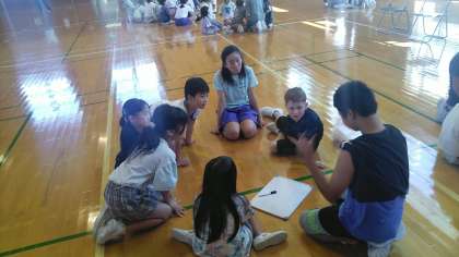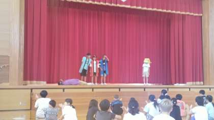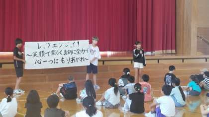ひいらぎ集会がありました。表現発表会をがんばろうということでスローガンの紹介がありました。みんなで楽しく活動するために、ファミリー班ごとに絵のしりとりゲームもしました。