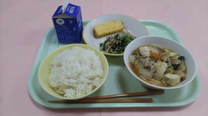今日の給食です。 【献立】 ごはん 牛乳 厚焼き卵 香味和え 肉豆腐 です。