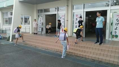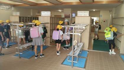 今朝の児童玄関の様子です。曇り空でしたが、みんな元気に登校してきました。