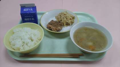 今日の給食です。 【献立】 ごはん 牛乳 豚肉の香り揚げ いり大豆和え つみれ汁 です。