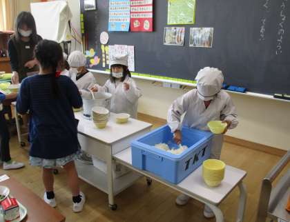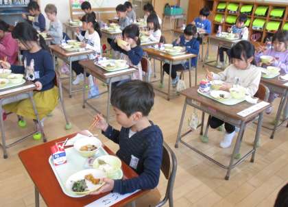 給食当番や配膳当番に分かれて、みんな落ち着いて準備をしていました。「おいしい、おいしい」と言いながらうれしそうに食べている子供や「食べられない」と困った様子の子供など様々でしたが、少しずつ学校給食にも慣れていけたらと思います。
