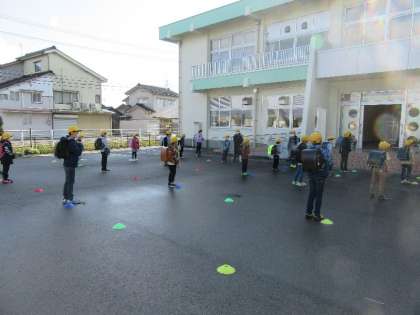 コロナウイルス感染症対策として、児童玄関での混雑を避けるため、間隔をあけ整然と並んで入る子供たち。規律正しく、相手を思いやる姿の表れです。