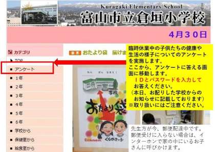 また、本日より、ホームページ上で回答してもらう「アンケート」を実施します。詳細については、配付した学校からのお便りを見てください。皆さんの回答をお待ちしております。