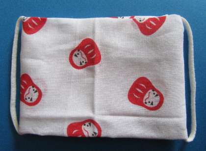 そこで、手ぬぐいでも作ってみました。簡単で、毎日洗えるので衛生的です。三つ折りにして1を2に通すだけ。ひもは、再利用です。七転び八起きのだるま模様が気に入っています。