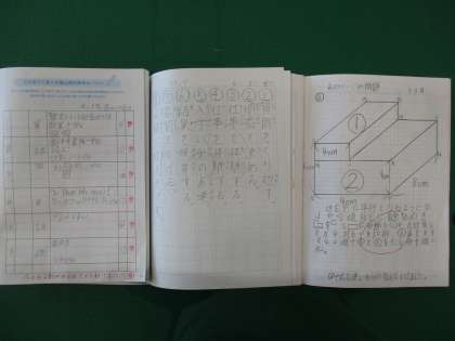 左から順に、毎日自分で一日の過ごし方を決めて取り組み、振り返りをしている友達、漢字練習をていねいに取り組んでいる友達、それから、算数で自分の考えを図と文で説明している友達のノートです。どのノートもとてもすてきですね。