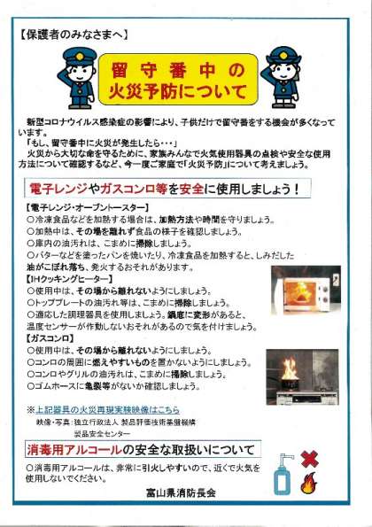 リーフレット「留守番中の火災予防について」 公開日 2020/05/14 更新日 2020/05/14 学校から 富山市消防局から火災予防についてのリーフリットが届きましたので、お知らせいたします。ご覧いただき、お子さんへの注意喚起をお願いします。