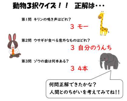 前に出した、動物3択クイズには何問正解できましたか?ふしぎだな?何でかな?と思った人は、ぜひもっとくわしく調べてみてくださいね!