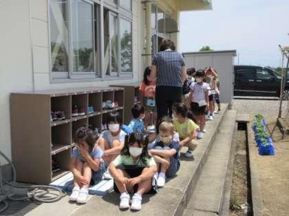 今年度初めての避難訓練を行いました。緊急放送の聞き方を覚え、学級での整列の仕方を確認し、静かに点呼を受けられるようにすることがねらいです。