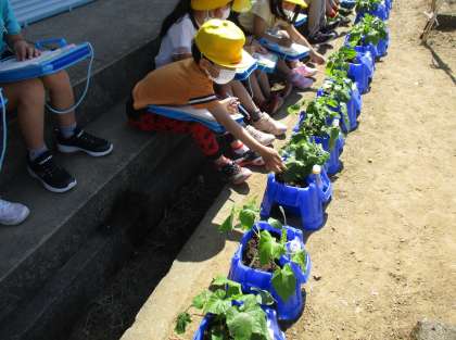 全員のアサガオがそろい、毎朝楽しそうに水やりをしています。だんだん大きくなってきたので、生活科の時間にアサガオの観察をしました。葉っぱをよく見てさわりながら、葉っぱの大きさや色、形などに注目して観察カードにしっかりと書いていました。つるも出てきたので、協力して支柱も立てました。「つるがでてきてほしいな」とうれしそうに話していました。