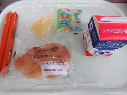 今日から、簡易給食が始まりました。個包装のパン、牛乳、ソーセージ等を組み合わせた給食です。