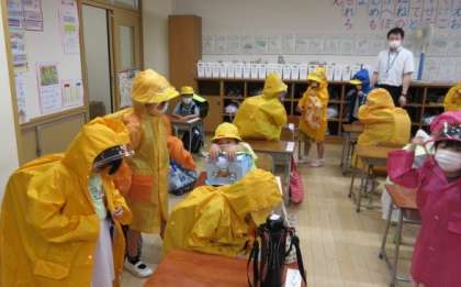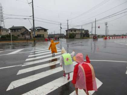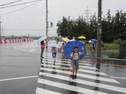 1年生は、初めて雨合羽を着ての下校となりました。雨の中、ズックがぬれることを心配しつつも、横断歩道ではしっかり手を挙げて渡る姿が見られました。明日も、朝から雨の予報が出ているので、足下にも気を付けて登校してください。