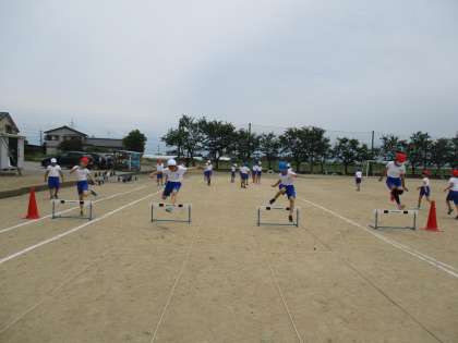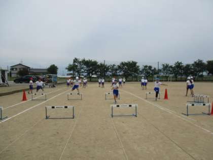 体育科の学習では、「ハードル走」に取り組んでいます。初めは1台だけでフォームを確かめながら跳び越し、途中で2台に増やして練習しました。