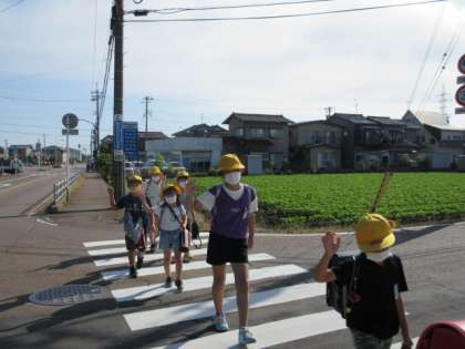「横断の意志を運転手に伝え、車に確実に止まってもらうため」ではありますが、もう一つ大切なことを子供たちに意識してもらいたいと考えています。「止まってくれて、ありがとう」の意志表示です。一つ一つの行動に、様々な意味があること、立場を代えて考えてみることを伝えていきたいと思います。