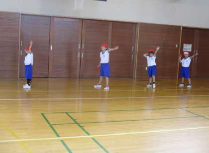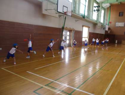 体育科の学習で初めて「ボール投げ」をしました。お手玉を使って「投げる方に向かって、おへそは横向きに」「斜め上にねらいを定めて」「ずばっと振り下ろそう」をポイントにして、投げる練習をしました。みんな汗びっしょりになって、遠くに投げようとがんばっていました。少しずつ遠くに投げられるようになるといいですね。